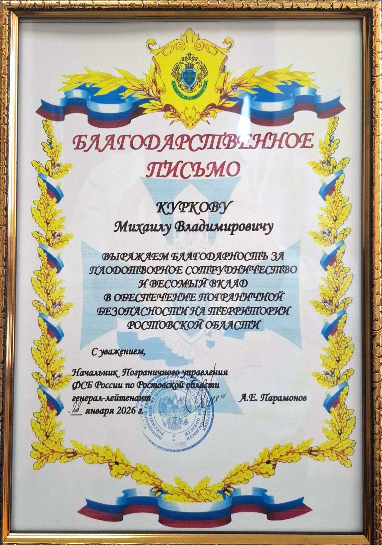 Ассоциация Строительства и Развития Дорожно-Строительной Инфраструктуры в лице Председателя Правления Куркова М.В. в 2025 году оказывала гуманитарную помощь военным Ростовской области, участвующим в зоне Специальной Военной Операции на Запорожском направлении. Руководство пограничного управления ФСБ России по Ростовской области 22 января 2026г вручило благодарственное письмо Куркову М.В.